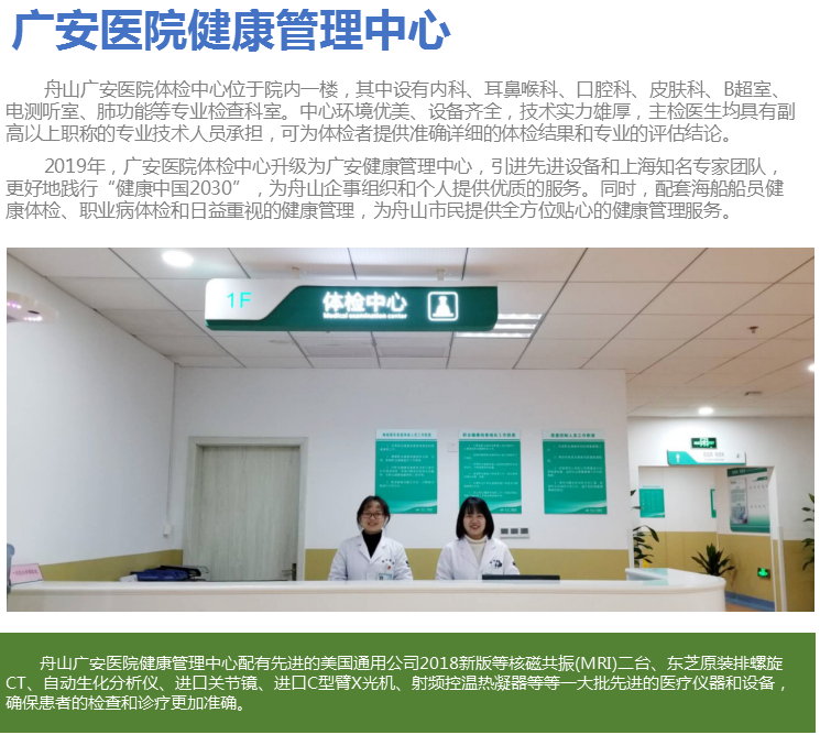 舟山廣安醫(yī)院成立于2003年12月18日,系浙江省二級甲等醫(yī)院,江西中醫(yī)藥大學(xué)、湖北中醫(yī)藥大學(xué)等教學(xué)實(shí)習(xí)醫(yī)院,由舟山市衛(wèi)計局管轄。