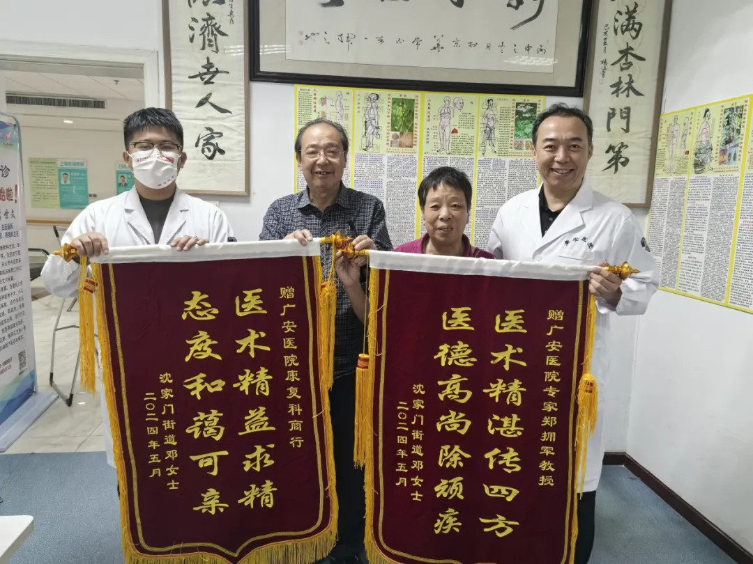 近日,廣安醫(yī)院疼痛科迎來(lái)了一幕溫馨感人的場(chǎng)景?;颊哙嚺亢图覍偈峙?面繡有“醫(yī)術(shù)精湛傳四方,醫(yī)德高尚除頑疾”、“醫(yī)術(shù)精益求精,態(tài)度和藹可親”字樣的錦旗,滿懷感激之情地來(lái)到科室,將這份特別的禮物親手交到了鄭擁軍醫(yī)生和助手商行的手中。