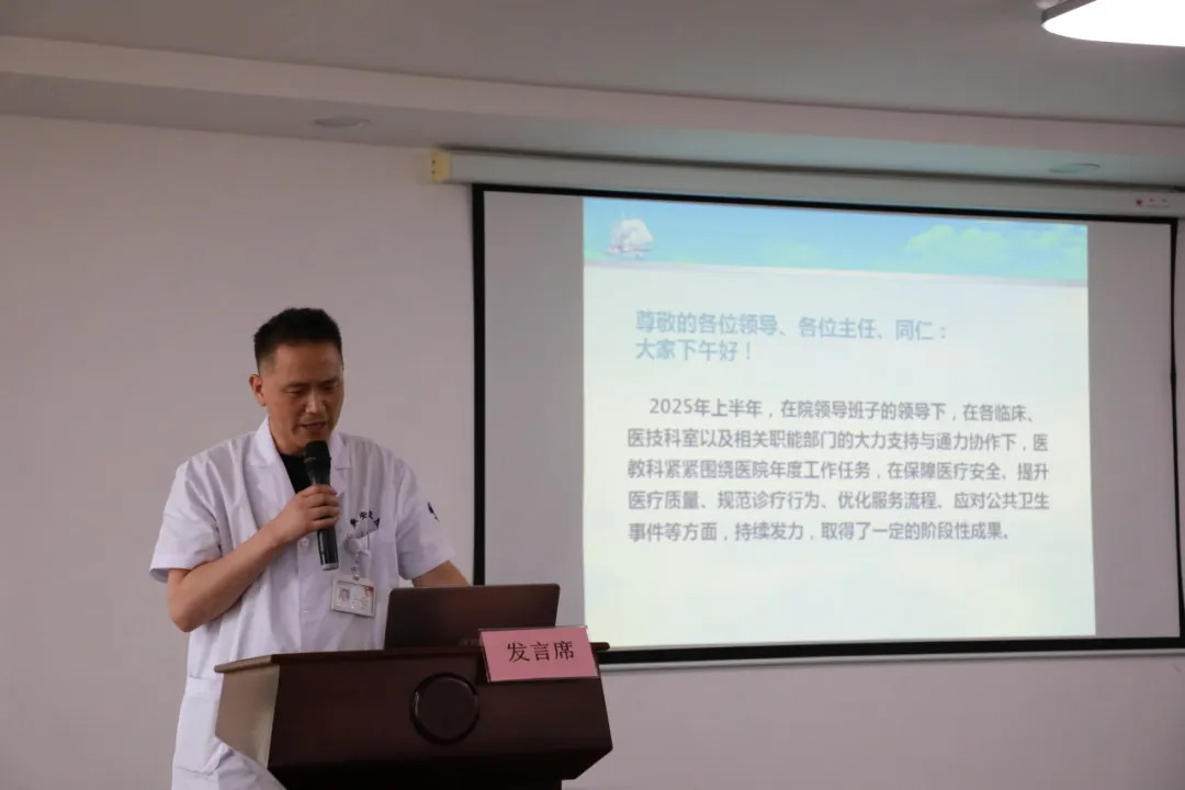 會(huì)議伊始,副院長(zhǎng)周正作《2025年上半年工作報(bào)告》。報(bào)告指出,上半年醫(yī)院緊緊圍繞醫(yī)療質(zhì)量安全與規(guī)范化管理,各項(xiàng)工作穩(wěn)步推進(jìn):一是醫(yī)療質(zhì)量安全持續(xù)強(qiáng)化,規(guī)范診療流程,保障患者安全;二是科室管理主體責(zé)任進(jìn)一步落實(shí),管理效能顯著提升;三是學(xué)科建設(shè)與醫(yī)療技術(shù)不斷突破,新技術(shù)、新項(xiàng)目有序開展; 四是醫(yī)保及DRGS工作扎實(shí)推進(jìn),控費(fèi)管理更加精細(xì)化;五是信息化建設(shè)持續(xù)優(yōu)化,智慧醫(yī)療水平不斷提升;六是安全生產(chǎn)常抓不懈,筑牢醫(yī)院安全防線;七是社會(huì)責(zé)任積極履行,公益義診、健康宣教等活動(dòng)廣受好評(píng)。