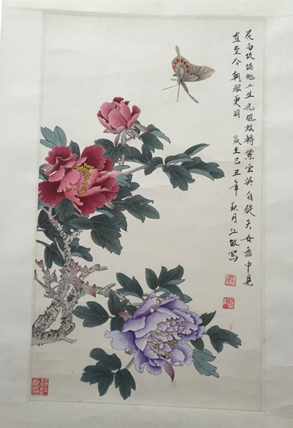 21日下午,在廣安醫(yī)院中醫(yī)正骨科辦公室,兩名醫(yī)生小心翼翼地展開- ~幅畫卷,畫上蝶繞牡丹,栩栩如生;花葉相扶,紅綠相襯。. 上面還賦有唐朝詩人元稹的一首《西明寺牡丹》:花向琉璃地上生,光風炫轉紫云英。自從天女盤中見,直至今朝眼更明。