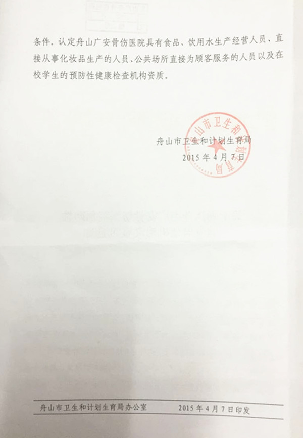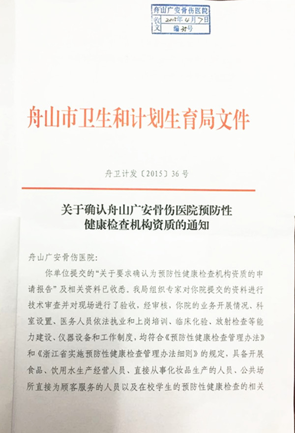 4月7日,接舟山市衛(wèi)生和計劃生育局文件,我院順利通過各項審核,獲得了預(yù)防性健康檢查機構(gòu)資質(zhì),認定我院具備開展食品、飲用水生產(chǎn)經(jīng)營人員,直接從事化妝品生產(chǎn)的人員,公共場所直接為顧客服務(wù)的人員以及在校學生的預(yù)防性健康檢查的相關(guān)條件。