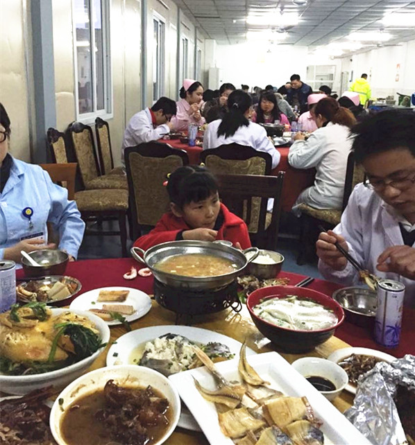 醫(yī)院貼心的為每個(gè)住院病人及醫(yī)護(hù)人員發(fā)了餐券。除夕夜,整個(gè)食堂一陣陣的歡聲笑語(yǔ)沖淡了大家對(duì)不能回家過(guò)年的失落與孤獨(dú)。