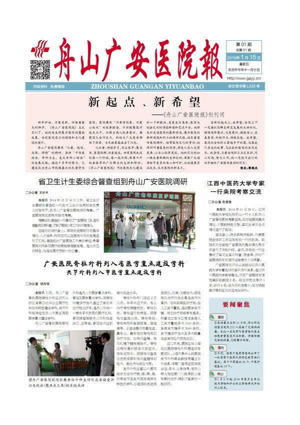 為了更好的宣傳醫(yī)院文化建設(shè),及時反映醫(yī)院的最新動態(tài),展示醫(yī)院的嶄新面貌和職工的精神風(fēng)貌,推廣最新的醫(yī)學(xué)技術(shù)與療法,經(jīng)過前期的一系列籌備,2015年1月,《舟山廣安醫(yī)院報》正式出刊。她的誕生,將更好的搭建醫(yī)生與患者,醫(yī)院與社會的溝通橋梁,提供一個更豐富的交流平臺,成為了醫(yī)院的新名片。