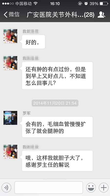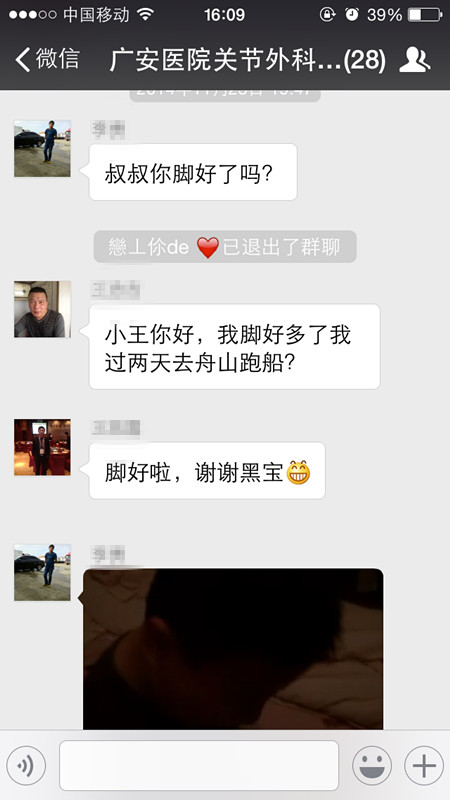 “廣安醫(yī)院關(guān)節(jié)外科朋友群”,已有患者28人,患者朋友們可以通過(guò)照片、視頻,多人、單一對(duì)話的模式,跟全科醫(yī)生或科主任咨詢,更可以相同病種間的患者私下交流。