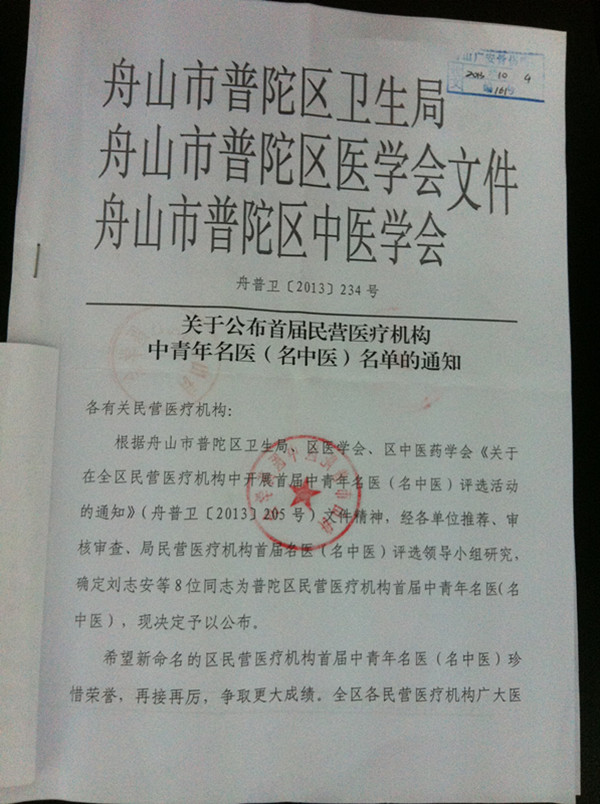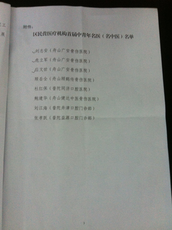 近日普陀區(qū)衛(wèi)生局民營醫(yī)療機(jī)構(gòu)首屆名醫(yī)(名中醫(yī))評(píng)選活動(dòng)圓滿結(jié)束。我院劉志安、危立軍、應(yīng)文世被評(píng)為區(qū)民營醫(yī)療機(jī)構(gòu)首屆中青年名醫(yī)(名中醫(yī))。