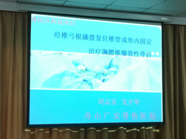 2012年12月26日,舟山市普陀區(qū)科技局組織有關專家,對舟山廣安骨傷醫(yī)院承擔的課題《頸椎弓根橇撥復位椎管成形椎體內(nèi)植骨內(nèi)固定治療胸腰椎爆裂性骨折》進行評審。寧波劉淵、舟山人民醫(yī)院、413醫(yī)院、解放軍113醫(yī)院等有關專家參加了本次評審工作。評委會聽取了課題組的工作報告,審閱了相關材料,一致認定本項目完成了課題預定的目標,對臨床有指導意義,特別是經(jīng)椎弓根撬撥復位椎管成形椎體內(nèi)植骨技術的運用具有創(chuàng)新性,達省內(nèi)本專業(yè)領先水平。一致同意通過評審。