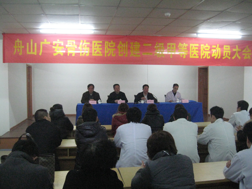 2012年3月6日下午舟山廣安骨傷醫(yī)院在會議室召開創(chuàng)建二級甲等醫(yī)院動員大會,郭維杰、焦忠偉、劉旭日、劉志安出席本次會議,醫(yī)院全體工作人員參加本次會議。本次會議主要討論了有關(guān)創(chuàng)建二級甲等醫(yī)院的有關(guān)事項以及各科室所需要做的準(zhǔn)備工作,創(chuàng)建二級甲等醫(yī)院是今年醫(yī)院最重要的事情之一,郭維杰院長強調(diào)大家一定要全力以赴為創(chuàng)建工作共同努力。2012年3月6日下午召開創(chuàng)建二級甲等醫(yī)院動員大會,全體工作人員參加本次會議。
