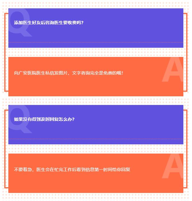 為減少交叉感染,同時(shí)又為患者排憂解難,解答健康相關(guān)問題,廣安醫(yī)院提醒您,在這特殊時(shí)期,如果需要,請各位患者朋友通過線上問診的方式和醫(yī)生在線溝通。廣安醫(yī)院的醫(yī)生們,為您提供專業(yè)的健康指導(dǎo)!