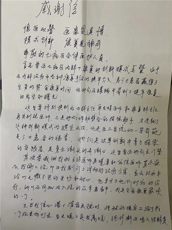 正如張大爺信中所言,是廣安醫(yī)院治療+康復的創(chuàng)新治療模式,為廣大患者贏得了寶貴的黃金康復時間。是內(nèi)科和康復科醫(yī)生的珠聯(lián)璧合、強強聯(lián)手,讓患者們相信康復的曙光就在眼前。
