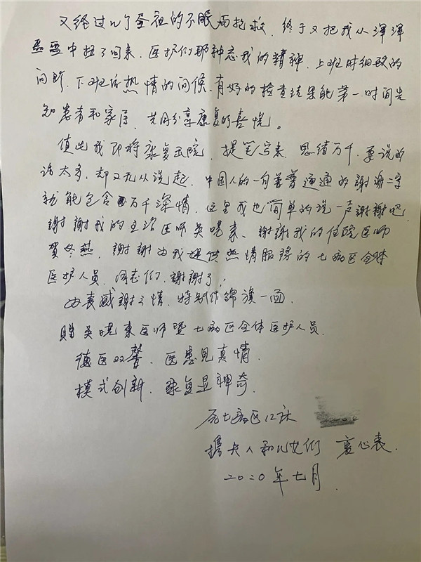 8月17日上午,在出院前,張大爺將一封手寫的感謝信及兩面錦旗分別交到了在他住院期間悉心醫(yī)護他的醫(yī)護人員的手上,以感謝他們在這半年多來的盡心救治與關(guān)懷。