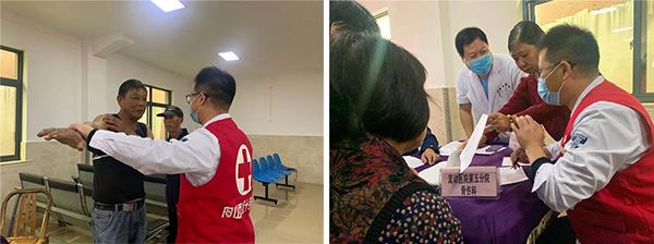 “大爺,您的肩膀是因?yàn)槟憬?jīng)常下地干活,有點(diǎn)勞損了。我來給您推拿一下,您會感覺舒服、松快一點(diǎn)!”說話的是我院康復(fù)科的曾定醫(yī)生,一名“精神小伙”。從義診開始到結(jié)束,他的雙手便沒有停歇過,一直忙著為患者們推拿、扎針。天氣微涼,曾定的頭上卻滿是汗珠,但每當(dāng)大爺大媽們關(guān)心地問他累不累時,他總燦爛地笑道:“不累!”