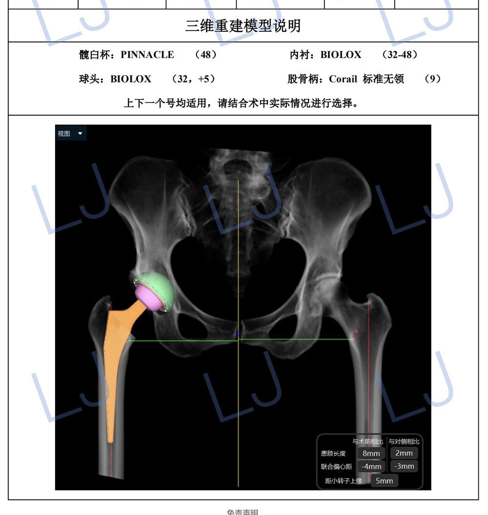 人工智能輔助全髖關(guān)節(jié)置換手術(shù)解決方案(AI HIP),基于術(shù)前CT圖像,實現(xiàn)三維重建解剖模型,智能識別解剖位點,并根據(jù)股骨及髖臼的解剖形態(tài),智能匹配最適假體類型、型號大小及安放位置,給術(shù)者提供最優(yōu)的個性化定制手術(shù)方案,以便最大程度重建并恢復患側(cè)髖關(guān)節(jié)的肢體長度、偏心距、宿主骨覆蓋等,同時降低術(shù)后關(guān)節(jié)脫位率。該技術(shù)對于關(guān)節(jié)置換手術(shù)的術(shù)前精準規(guī)劃和術(shù)中精準操作有重要指導的意義。