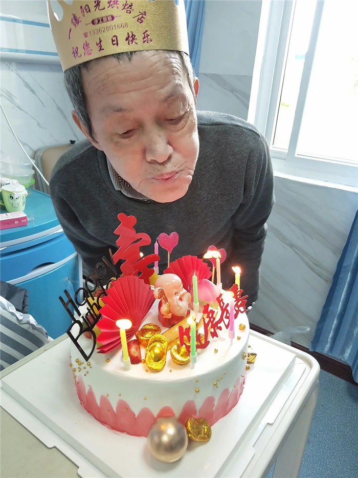 當(dāng)單主任帶著眾多醫(yī)護(hù)人員捧著蛋糕進(jìn)入病房時,陳阿公感動得無以言表。戴上生日帽,點(diǎn)上蠟燭,唱起生日快樂歌,陳阿公的臉上,洋溢著幸福的笑容。