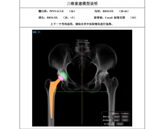 據(jù)羅軍主任介紹,他們首先將鄭阿姨的術(shù)前CT數(shù)據(jù)導(dǎo)入到系統(tǒng)中,通過自動(dòng)識別骨盆和股骨建立了計(jì)算機(jī)數(shù)字三維模型。AI HIP顯示患者適合使用合適的髖臼杯、股骨柄、標(biāo)準(zhǔn)陶瓷球頭、陶瓷內(nèi)襯,并精準(zhǔn)定位了截骨線,有效幫助醫(yī)生在手術(shù)中做到精確截骨。