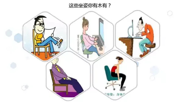 行走坐立時應保持姿勢端正,不要弓腰、駝背、蹺二郎腿等等不良姿勢;長期低頭看手機或伏案工作的人,最好每半個小時休息活動一下。
