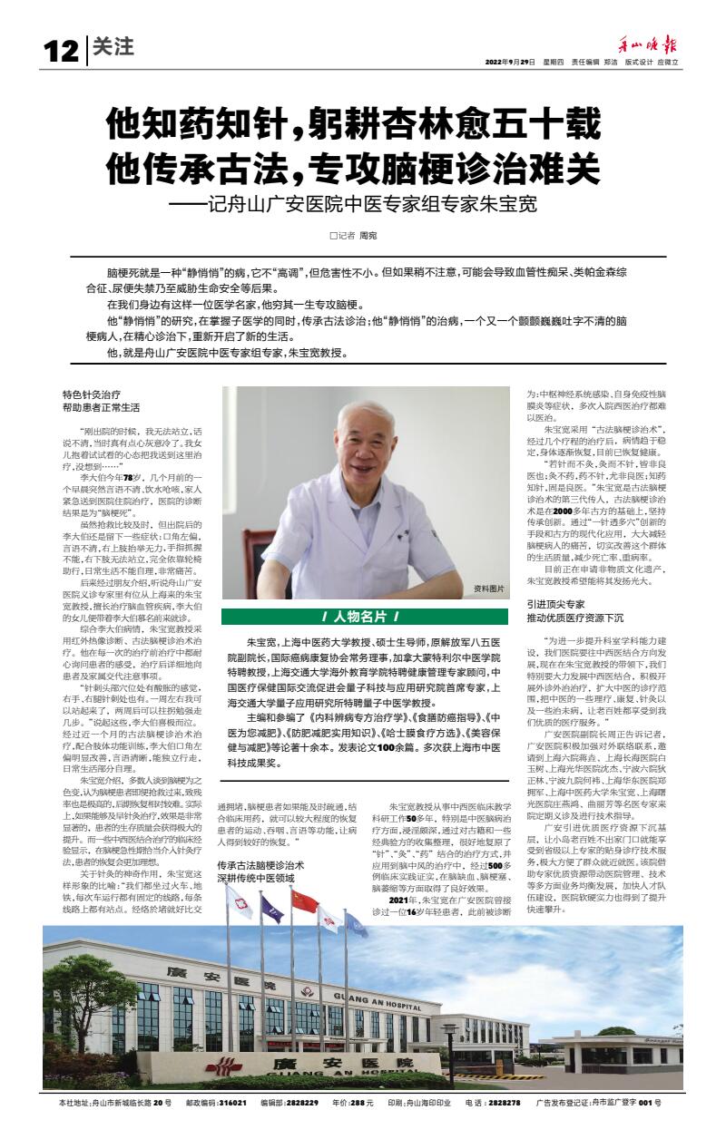 后來(lái)經(jīng)過(guò)朋友介紹,聽(tīng)說(shuō)舟山廣安醫(yī)院義診專家里有位從上海來(lái)的朱寶寬教授,擅長(zhǎng)治療腦血管疾病,李大伯的女兒便帶著李大伯慕名前來(lái)就診。