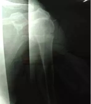 70多歲的鮑阿婆在家人陪同下來(lái)到上海大團(tuán)醫(yī)院就診。大團(tuán)醫(yī)院的醫(yī)生給鮑阿婆左肩部做了X線片檢查。片子拍出來(lái)竟然是左肱骨近端粉碎性骨折。外科頸,大結(jié)節(jié)都碎了,而且骨折端移位很?chē)?yán)重。