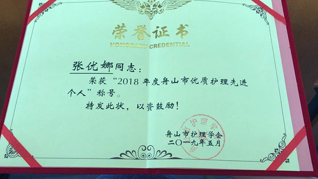 二十多年來,天天如此。在剛剛結(jié)束的舟山市5.12國際護(hù)士節(jié)表彰大會(huì)上,我院張優(yōu)娜榮獲2018年度舟山市優(yōu)秀護(hù)理先進(jìn)個(gè)人這一殊榮,這便是對(duì)她辛勤工作的最好肯定。