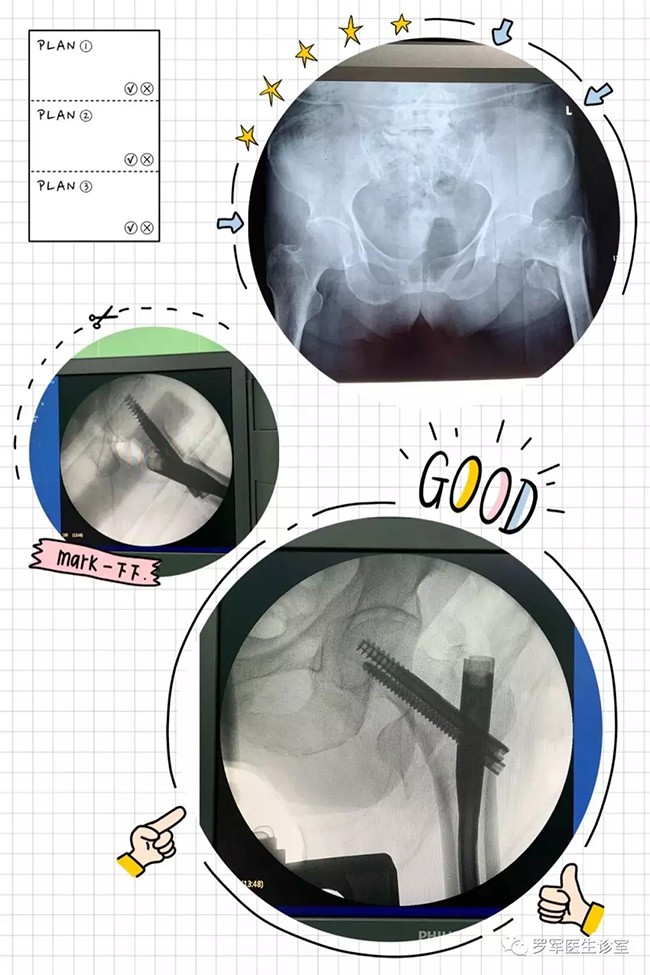 5月7日,羅軍主任帶領(lǐng)手術(shù)團(tuán)隊按照術(shù)前的討論方案,在C臂機透視下,采用三個微創(chuàng)手術(shù)通道,施行精準(zhǔn)閉合復(fù)位、定位、固定,僅用了大約30分鐘,便成功完成微創(chuàng)內(nèi)固定手術(shù)。手術(shù)進(jìn)行順利,第二天老人就可以在床邊坐起了。老奶奶非常開心,叫家人一定要送面錦旗給醫(yī)生。