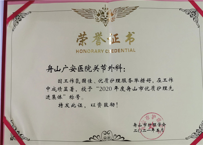 經(jīng)舟山市衛(wèi)健委、舟山市護(hù)理學(xué)會(huì)評(píng)定,我院關(guān)節(jié)外科在護(hù)士長劉燕的帶領(lǐng)下,憑借扎實(shí)的理論基礎(chǔ)、高超的護(hù)理技術(shù)、嚴(yán)謹(jǐn)?shù)穆殬I(yè)操守、人性化的服務(wù)理念被評(píng)選為“2020年度舟山市優(yōu)質(zhì)護(hù)理先進(jìn)集體”。