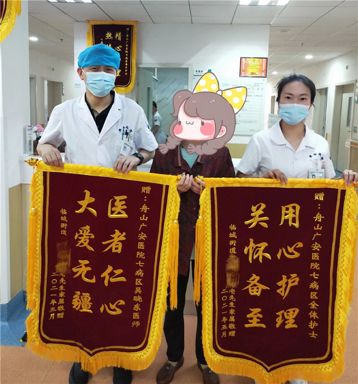 6月7日上午,為表示對(duì)病區(qū)醫(yī)護(hù)人員的感謝,孫老先生的家人一大早就送來(lái)了錦旗。“我沒(méi)有見過(guò)一家醫(yī)院的醫(yī)護(hù)人員像廣安醫(yī)院這樣細(xì)心負(fù)責(zé)。吳曉東醫(yī)生醫(yī)術(shù)高明,態(tài)度又好。病區(qū)里的護(hù)士們,各個(gè)又親切、又仔細(xì),對(duì)我們就像對(duì)自己的爺爺奶奶一樣。從早到晚噓寒問(wèn)暖,每天進(jìn)進(jìn)出出忙里忙外的,卻從來(lái)沒(méi)有不耐煩。這些我們都看在眼里記在心里。衷心感謝他們!”孫老先生的太太說(shuō)道。