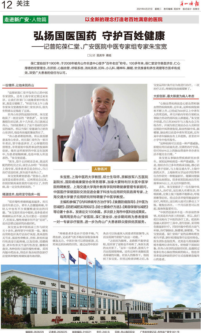 廣安人懷揣著對于醫(yī)療的敬畏和對舟山人的大愛,將以更加昂揚(yáng)的姿態(tài)和海納百川的胸懷,不斷把學(xué)科建設(shè)和醫(yī)療技術(shù)水平推向更高的境界,服務(wù)舟山、造福社會(huì)。