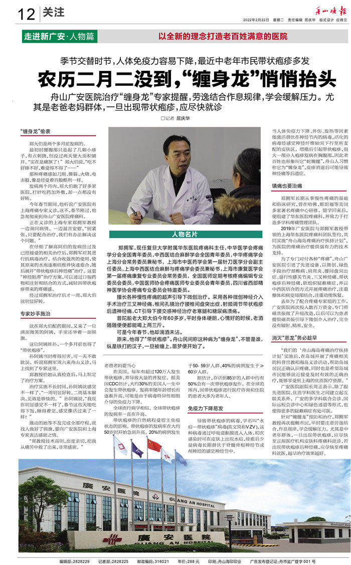 廣安人懷揣著對于醫(yī)療的敬畏和對舟山人的大愛,將以更加昂揚的姿態(tài)和海納百川的胸懷,不斷把學科建設和醫(yī)療技術水平推向更高的境界,服務舟山、造福社會。