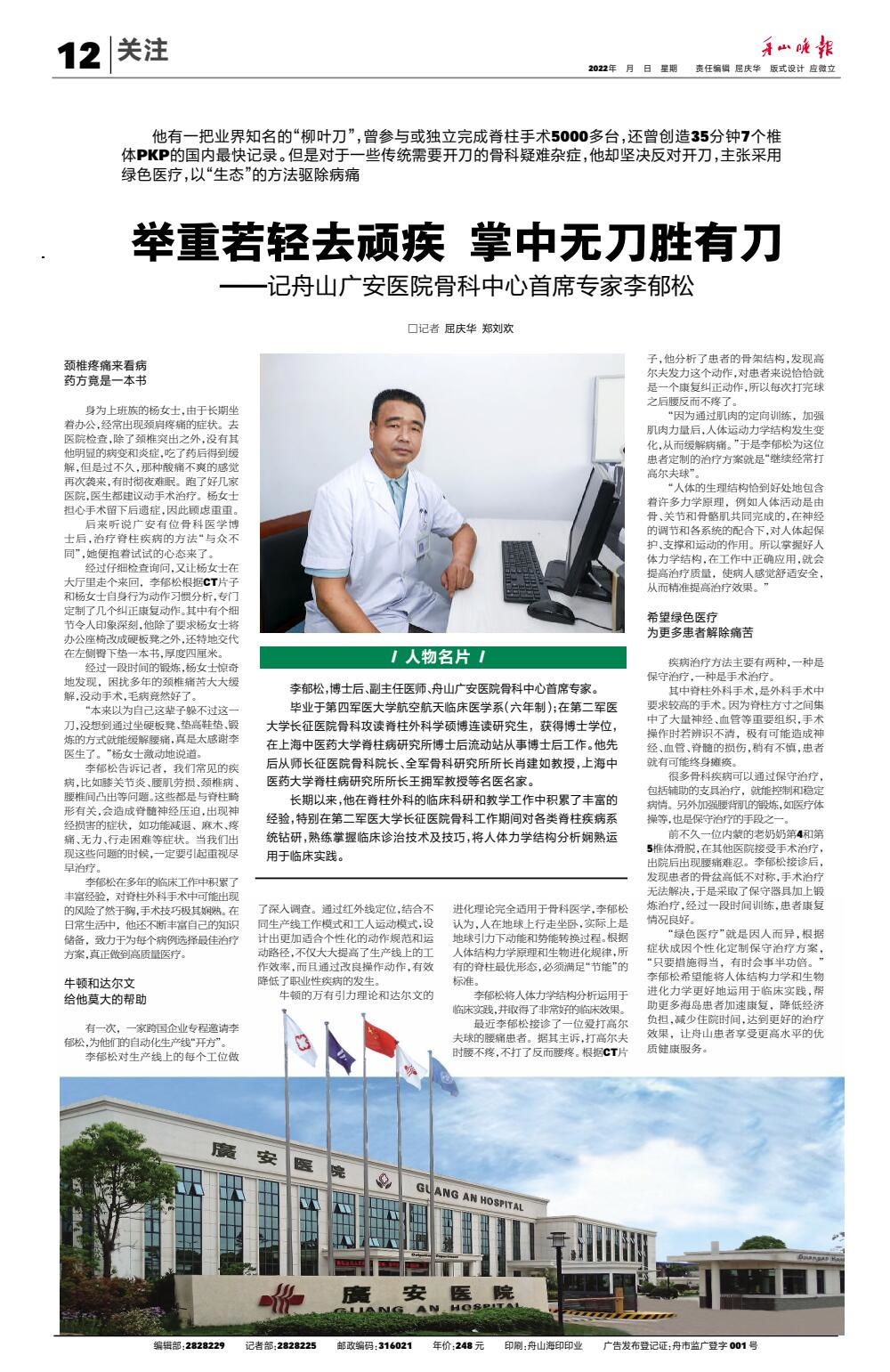 廣安人懷揣著對于醫(yī)療的敬畏和對舟山人的大愛,將以更加昂揚的姿態(tài)和海納百川的胸懷,不斷把學(xué)科建設(shè)和醫(yī)療技術(shù)水平推向更高的境界,服務(wù)舟山、造福社會。