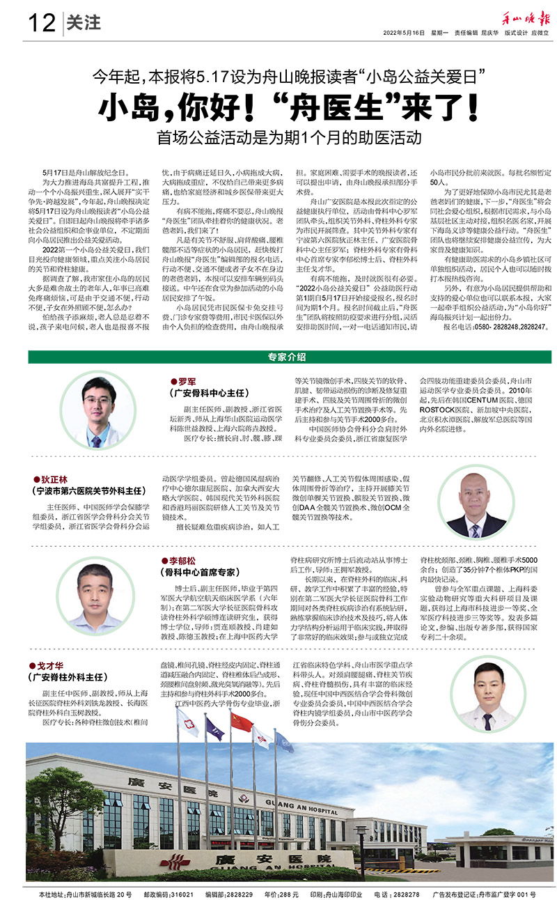 廣安人懷揣著對于醫(yī)療的敬畏和對舟山人的大愛,將以更加昂揚(yáng)的姿態(tài)和海納百川的胸懷,不斷把學(xué)科建設(shè)和醫(yī)療技術(shù)水平推向更高的境界,服務(wù)舟山、造福社會(huì)。