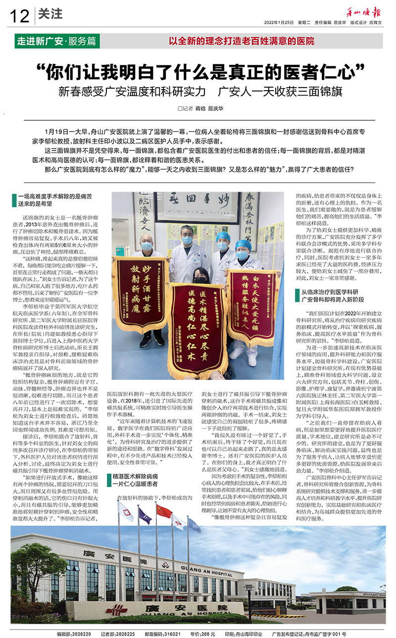 廣安人懷揣著對于醫(yī)療的敬畏和對舟山人的大愛,將以更加昂揚(yáng)的姿態(tài)和海納百川的胸懷,不斷把學(xué)科建設(shè)和醫(yī)療技術(shù)水平推向更高的境界,服務(wù)舟山、造福社會。