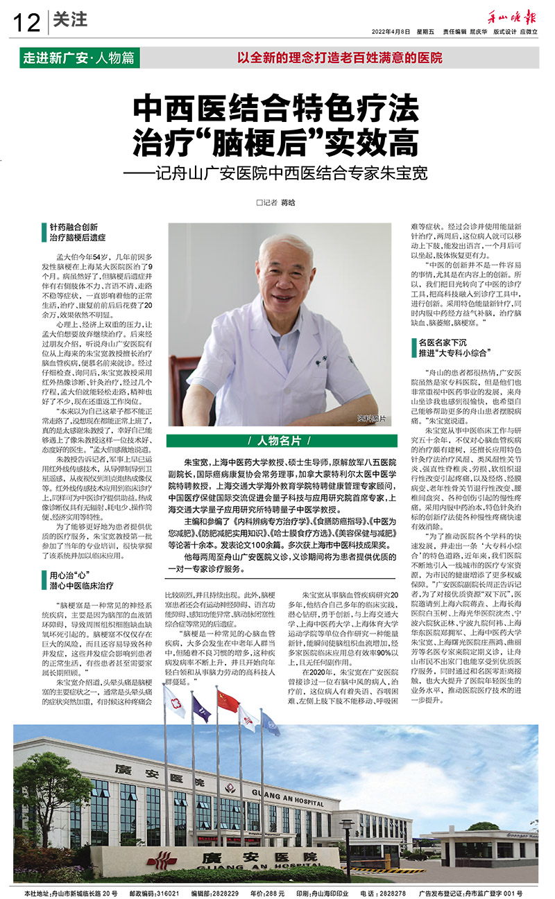 中西醫(yī)結(jié)合特色療法 治療“腦梗后”實(shí)效高——記舟山廣安醫(yī)院中西醫(yī)結(jié)合專家朱寶寬