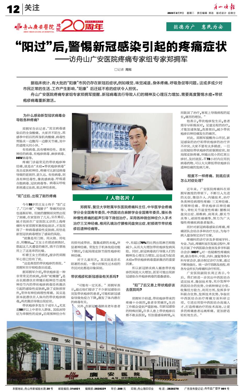 “陽過”后,警惕新冠感染引起的疼痛癥狀——訪舟山廣安醫(yī)院疼痛專家組專家鄭擁軍